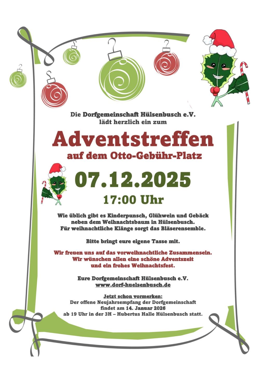 Die Dorfgemeinschaft lädt zum adventlichen Beisammensein neben dem Dorfweihnachtsbaum ein. Traditionell gibt es Fruchtpunsch, Glühwein und Gebäck; das Bläserensemble spielt Weihnachtslieder. Bitte bringen Sie ihre eigene Tasse mit. Am 07.[…]