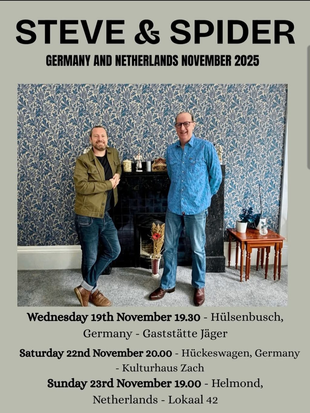 Am Mittwoch, 19. November, gibt es nochmal ein musikalisches „Schmankerl“ in der Gaststätte Jäger. Der uns allen allmählich wohlbekannte Steve Crawford und der großartige Virtuose an den Mundharmonikas, Spider McKenzie aus Schottland, geben ein gemeinsames Konzert in unserer kleinen Kneipe.