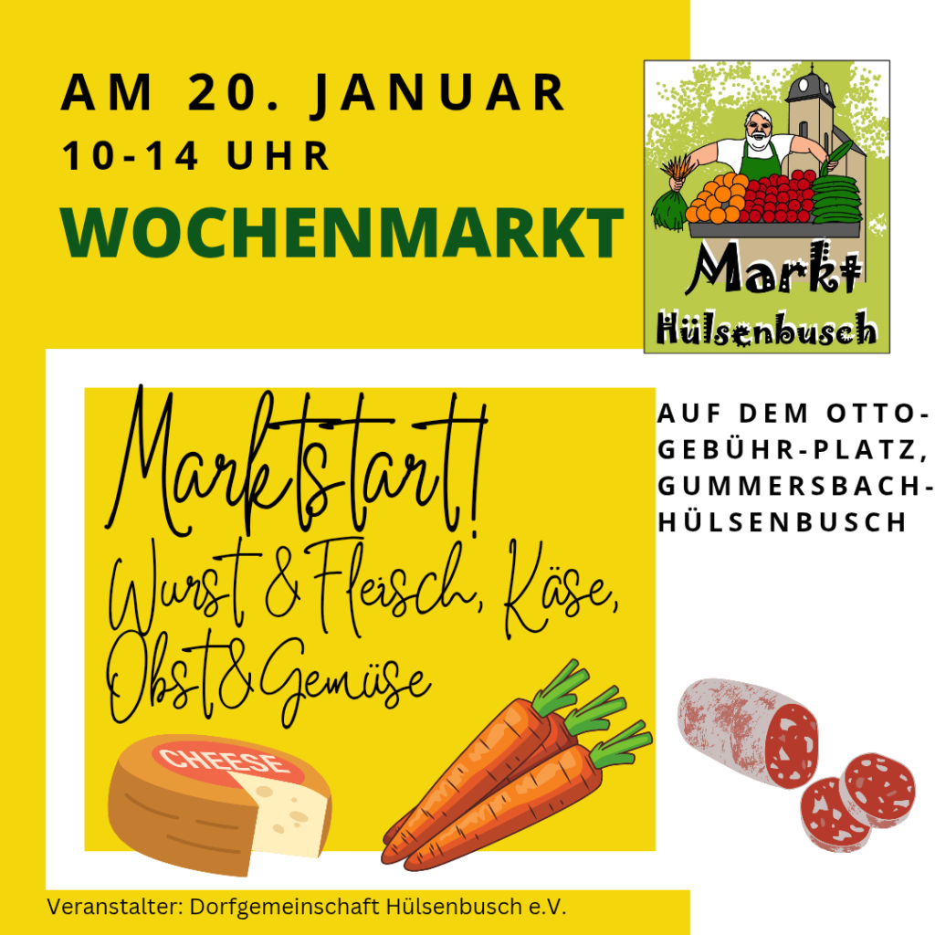 Am 20.01.2026 startet der Hülsenbuscher Wochenmarkt in die 10. Saison. Drei Händler starten. Die anderen folgen in den nächsten Wochen. Das Kaffeemobil ist ab März wieder da.