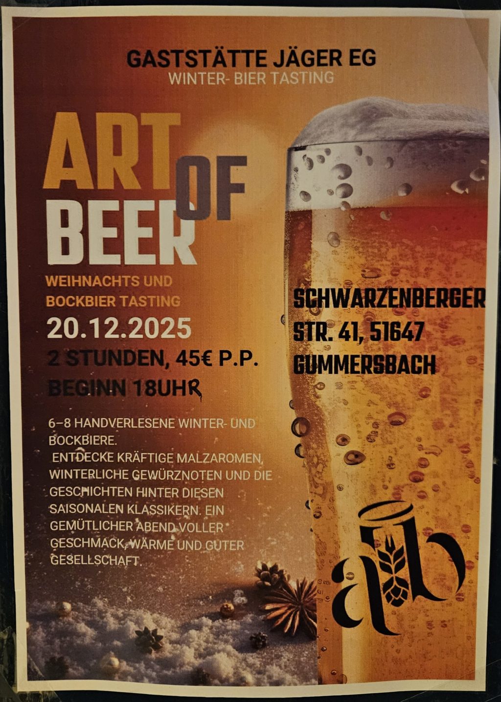 Nochmal kurz vor Weihnachten neue Biere kennenlernen. Thema: Weihnachts- und Bockbier 20.12.2025 ab 18 Uhr Preis: 45,00 Euro Karten gibt es in der Gaststätte Jäger beim Thekenteam.